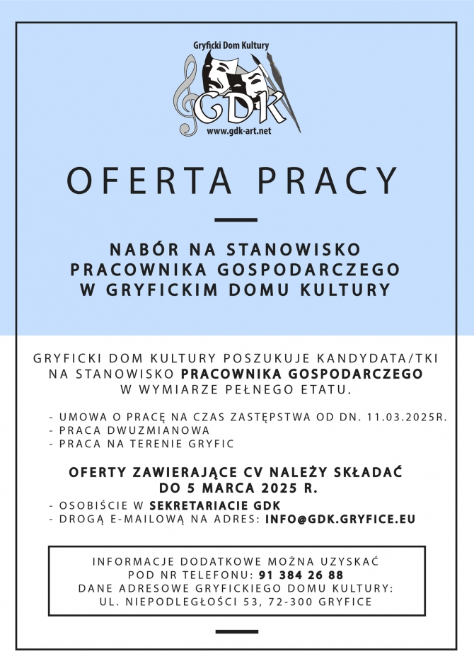 Gryficki Dom Kultury poszukuje kandydata/tki na stanowisko pracownika gospodarczego w wymiarze pełnego etatu.